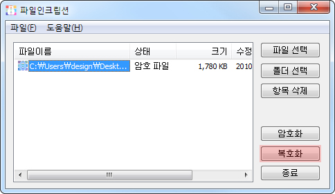 (1) 인크립션 프로그램을 실행하고 암호화 된 파일을 불러온 후 복호화 버튼을 클릭하여 복호화 할 수 있습니다.